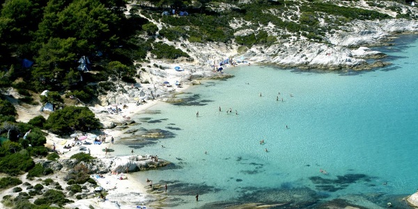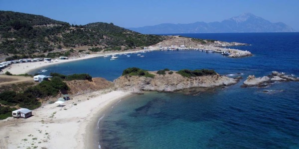 About 6km north of Sarti there is a cluster of small beaches in a coastline which is over 5km. This relief landscape of unparallel beauty looks like an open-air market of sculpture exhibition which in conjunction with the amazing turquoise waters and the view to Mount Athos compensates the visitor who has been afflicted through the bushes and the rocks in order to find these beaches. The lack of any form of organization gives the possibility and the pleasure to the free camper to set up their ‘nest’ among the rocks. To find these beaches you need to leave the main street of east Sithonia and cross a very difficult dirt road for about 350 meters up to the coastline.